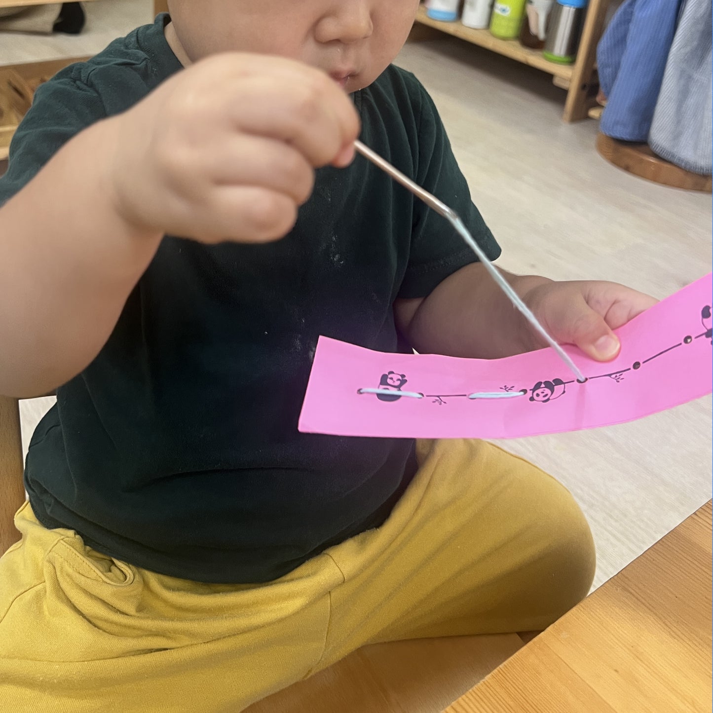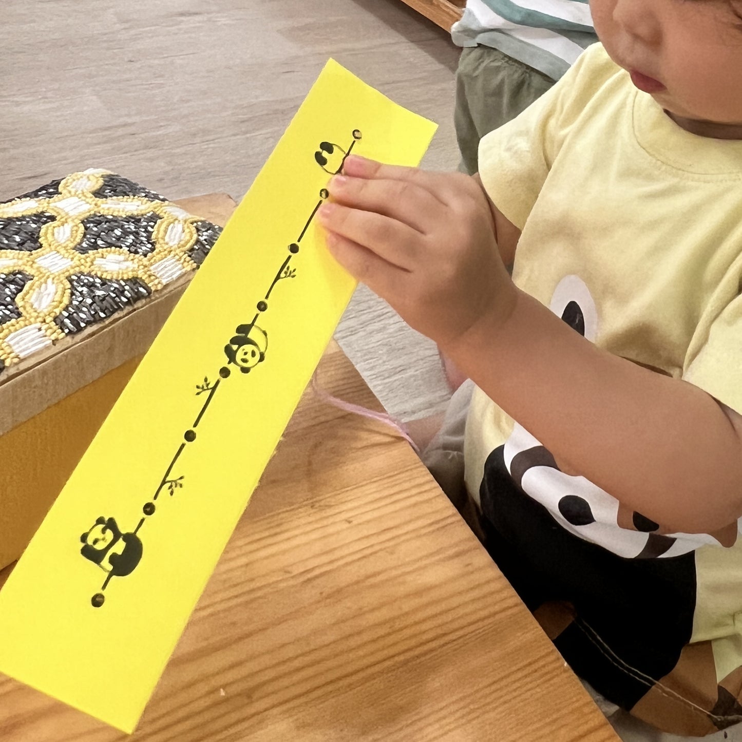 Using it is very simple. Print the template on A4-sized colored cardstock. Place it on a corkboard and use a push pin or punching tool to make holes along the dotted lines. For children under three, it’s smoother if an adult prepares the holes in advance. Once the holes are ready, children can use a tapestry needle and thread to stitch along the panda’s outline.