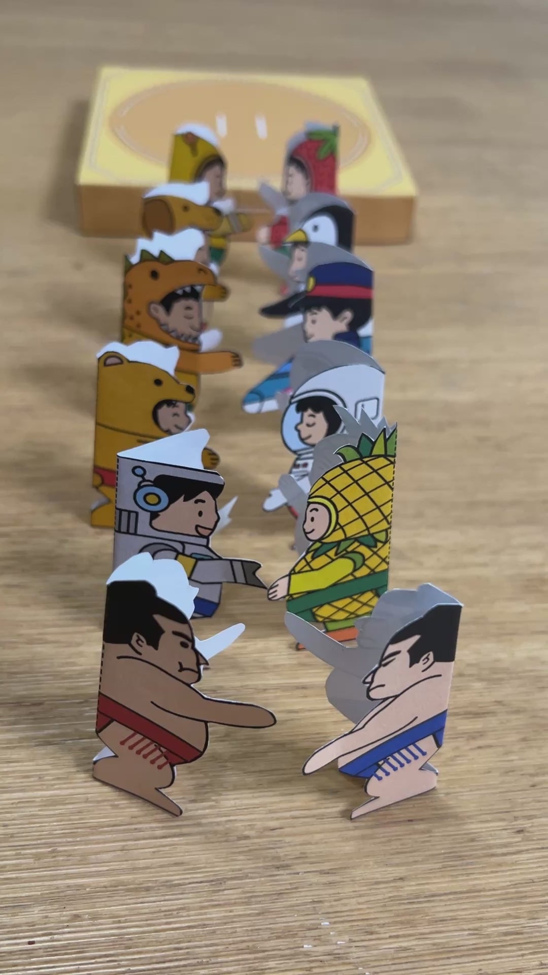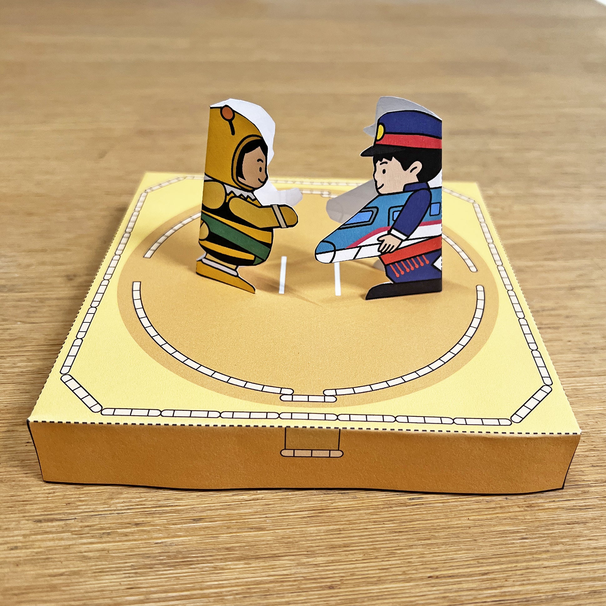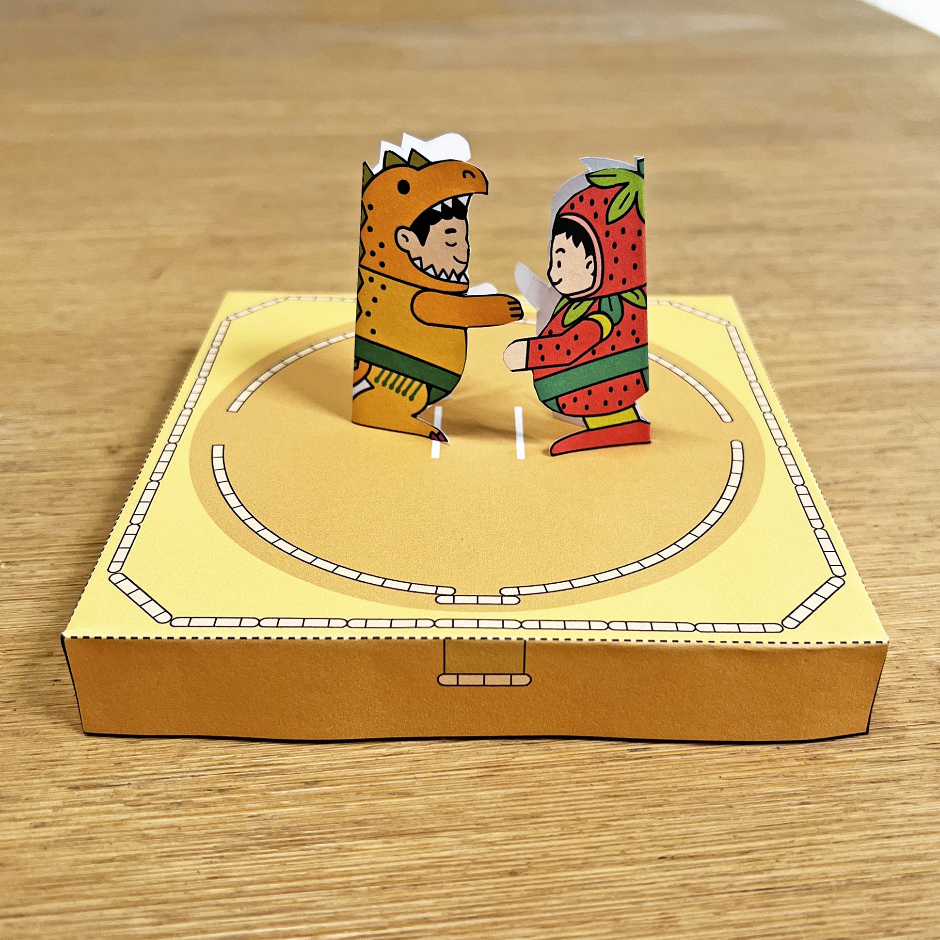 A printable sumo ring is included, but you can also use an empty box as your ring. To play, start with the wrestlers locked together, tap the edge of the ring lightly with your fingers, and try to knock your opponent down. Avoid hitting too hard or they’ll fall over quickly — start gently and build up the excitement.