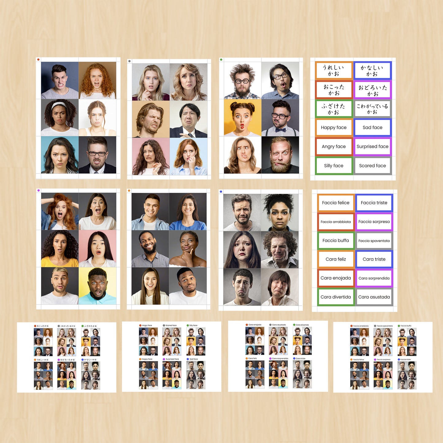 One activity idea is to use the name cards and picture cards for matching. Lay out the cards and ask your child to pick up one at a time, matching it with the corresponding name card while thinking about “What kind of expression is this?” The set includes name cards in Japanese, English, Italian, and Spanish. Please print only the languages you need. If you’d like additional languages, feel free to reach out, and we’ll be happy to add them.