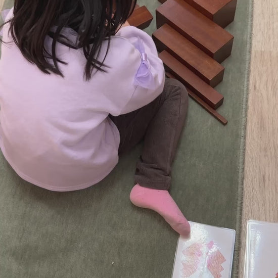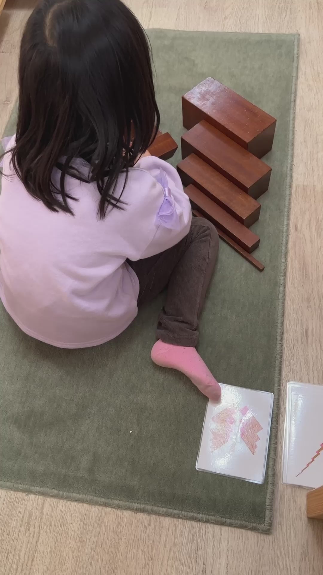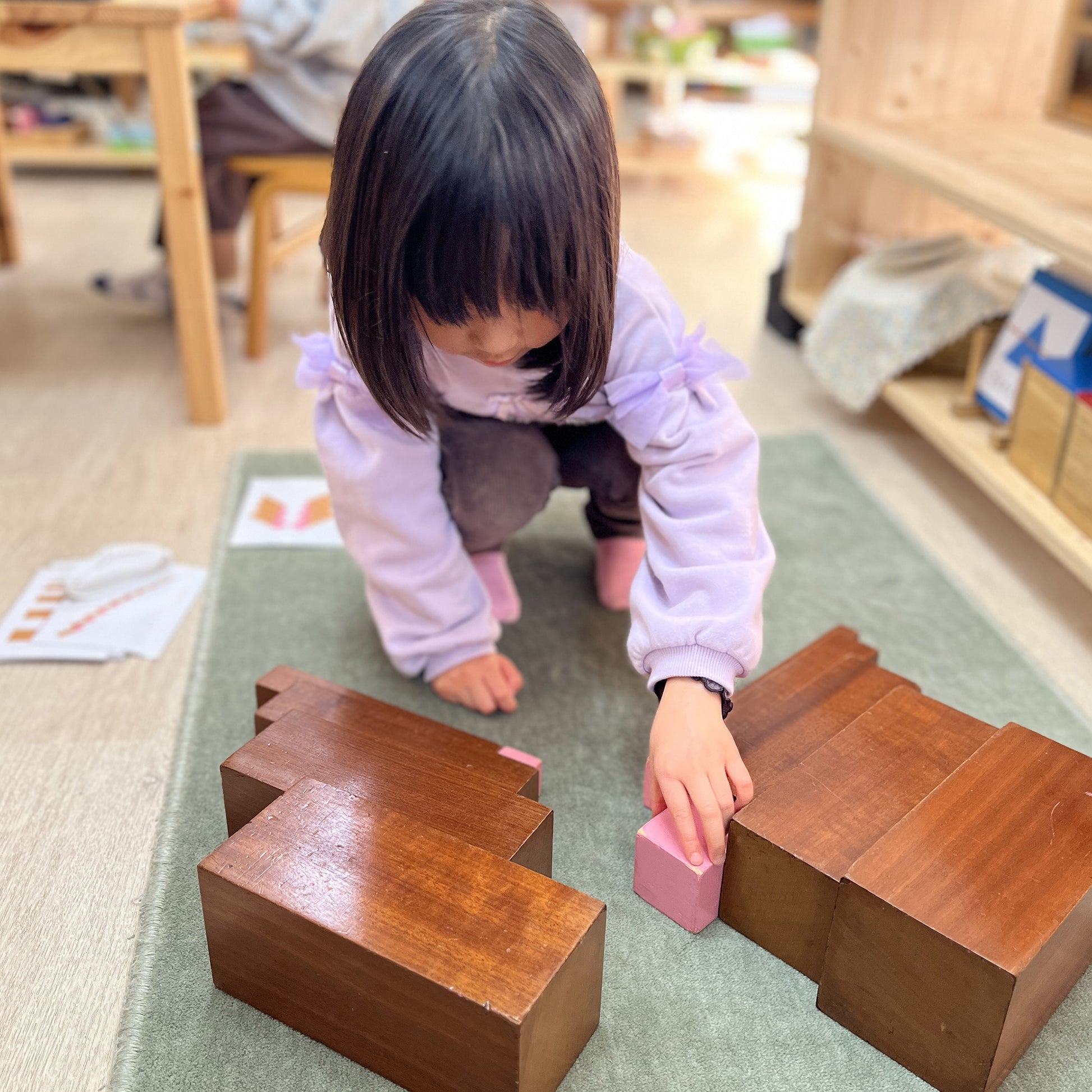 At the same time, the Pink Tower and Brown Stair are materials that continue to grow with the child. By using these pattern cards, children are invited to explore new ways of arranging, combining, and constructing shapes. Variations such as working from pattern cards or using blindfolded activities allow older children to deepen and refine their sensorial experiences, making these materials engaging well into the kindergarten years.