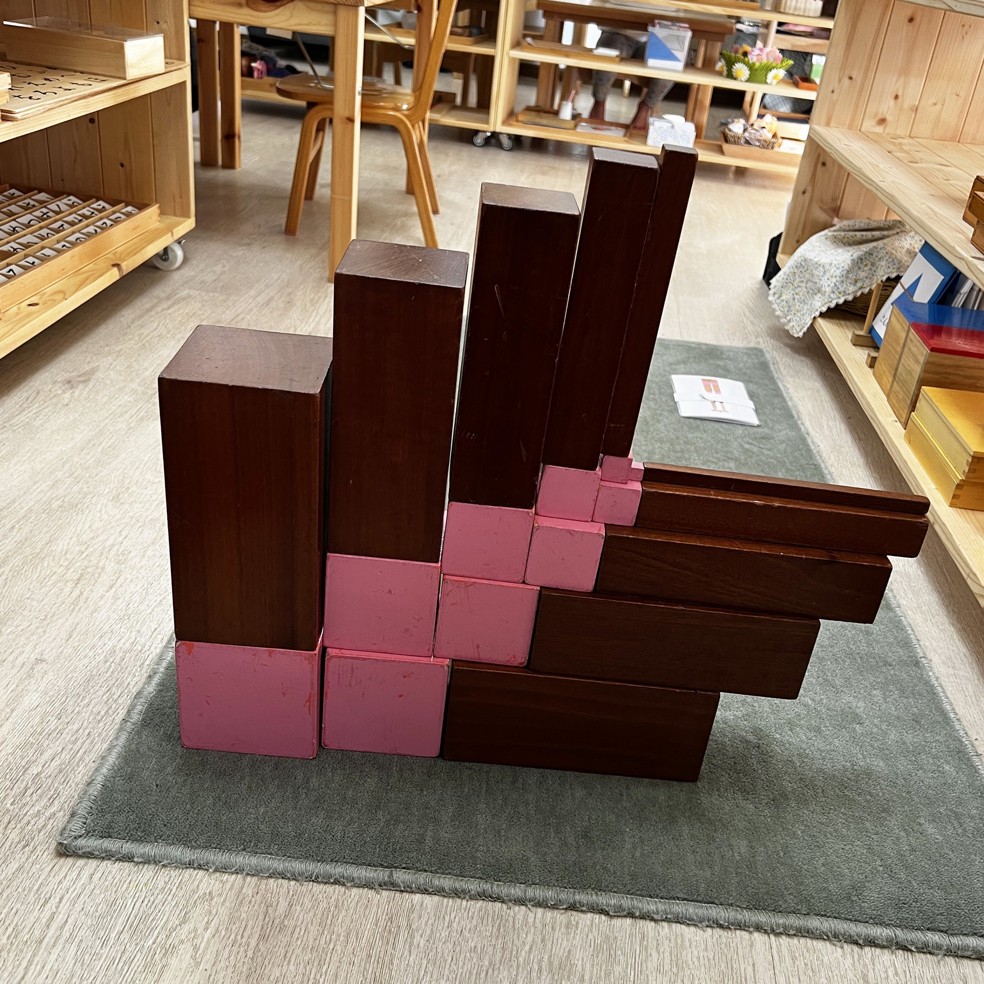 The Pink Tower is a classic Montessori sensorial material that helps children notice differences in size through a series of cubes that gradually change from large to small.